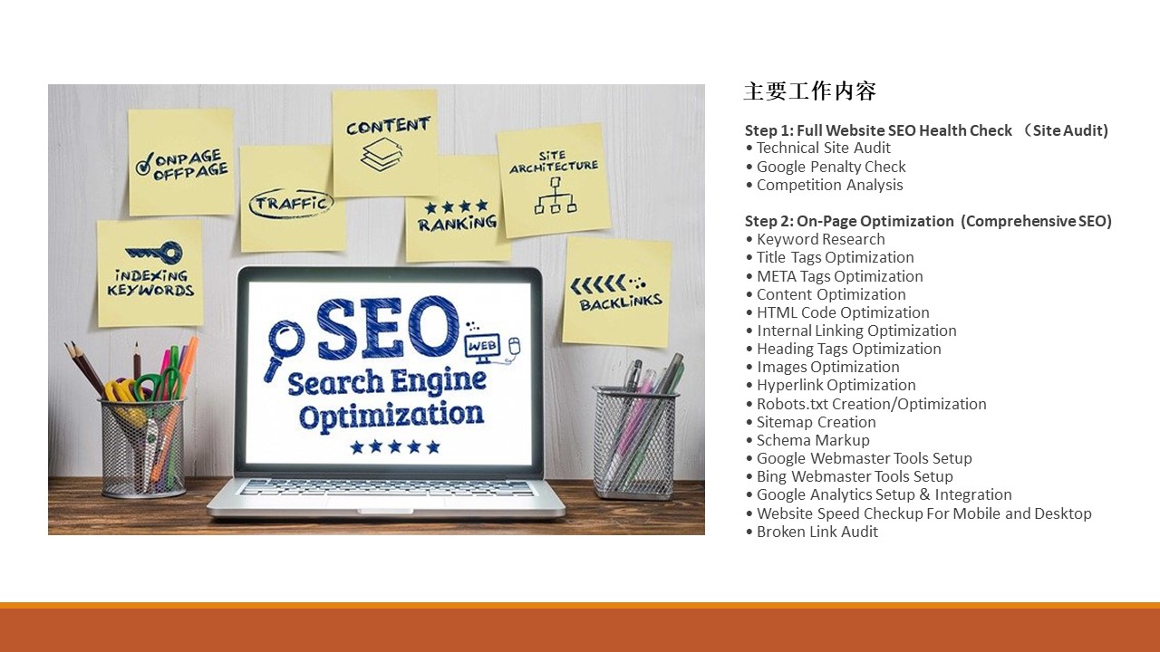Index、HTTPS检测、XML导航、schema、锚点,H1\H2\H3标签、Meta 描述、图片alt标签、内链、外链、无效链接、标题、关键字、内容、网页核心性能指标(谷歌)、重复网页、canonical优化、Google Analytics 安装、Google search console安装、Bing Webmaster 安装、手机/网页版速度优化
