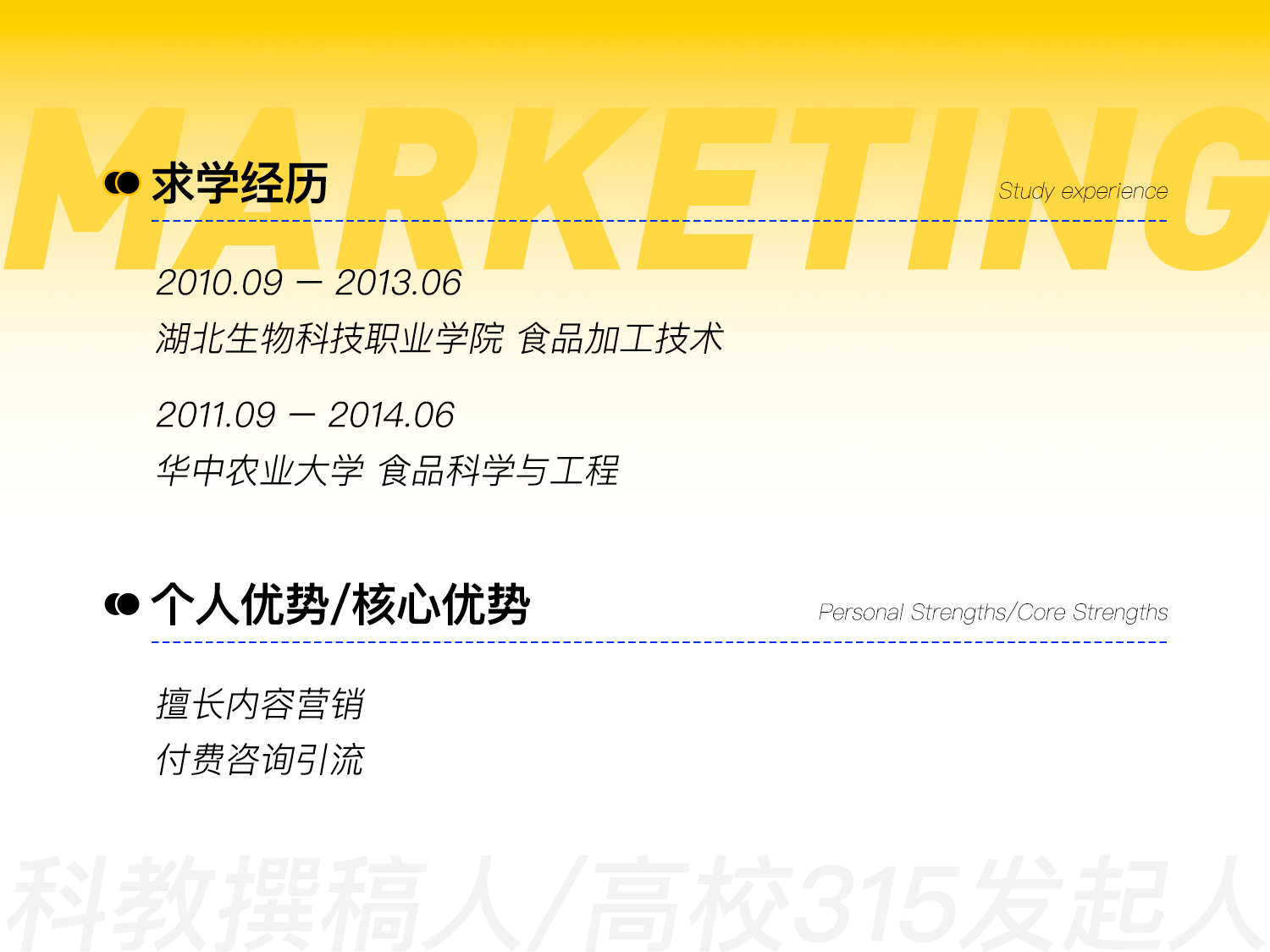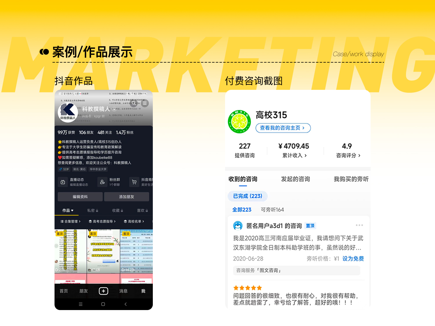 1、本人擅长内容营销和付费咨询引流,有8年升学择校咨询经验;