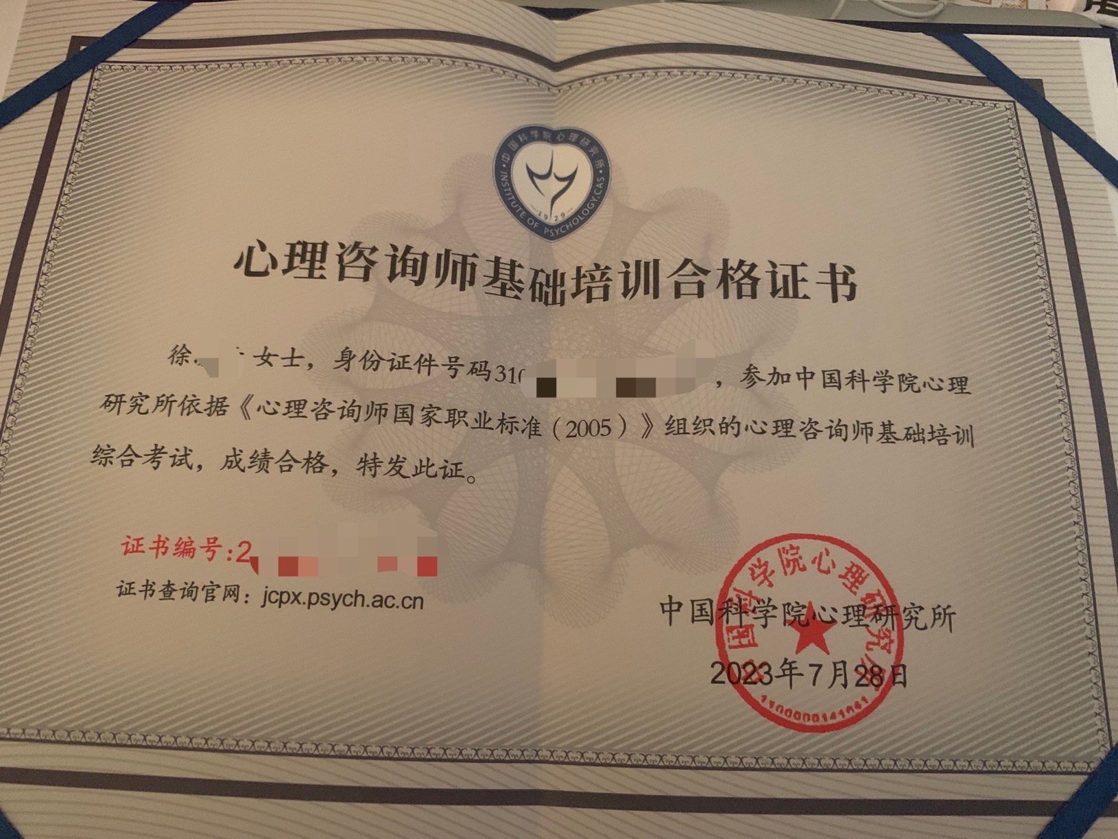 4、中科院心理咨询师合格证
