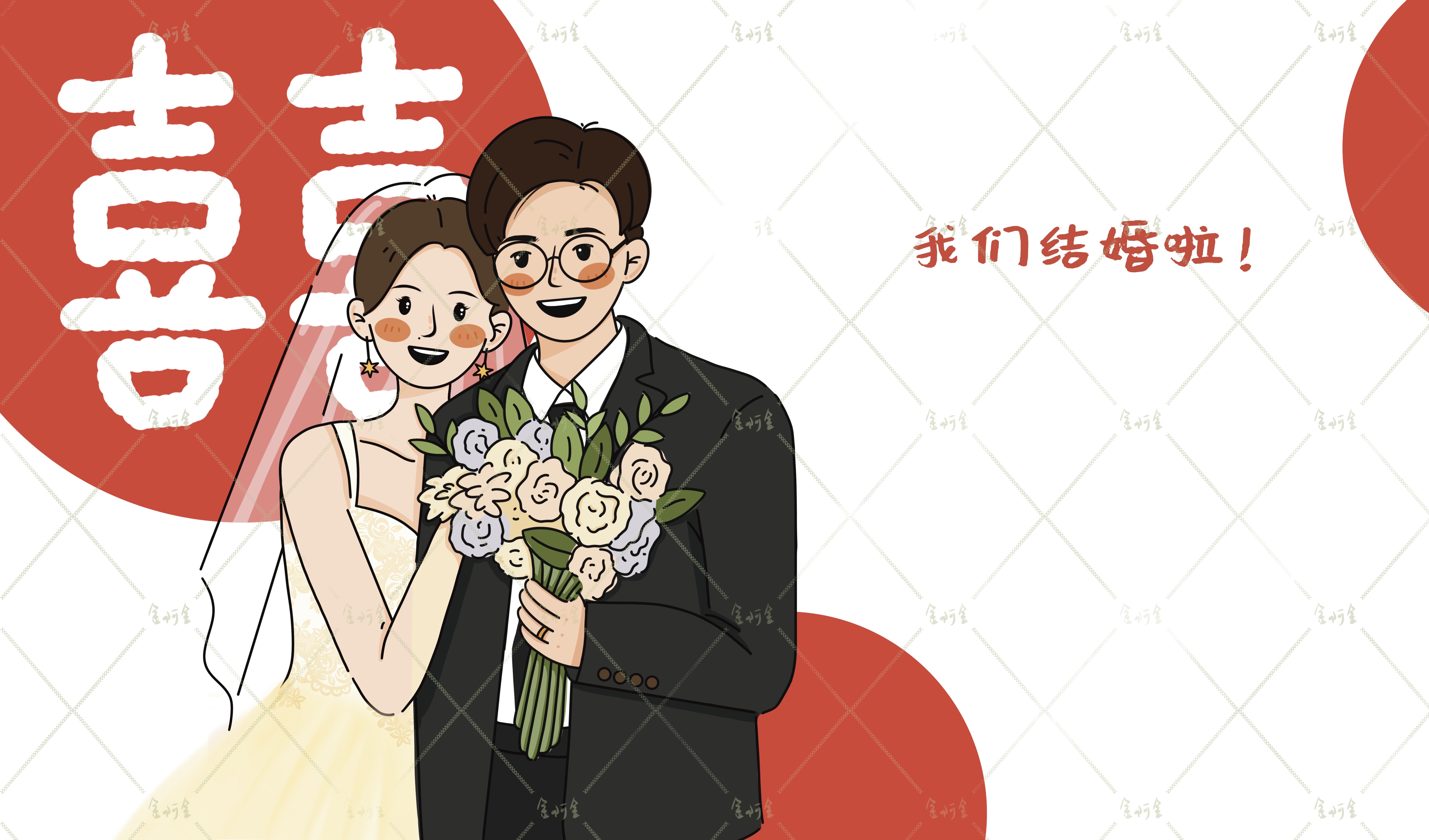 1、一份高质量的双人全身人物婚礼插画设计