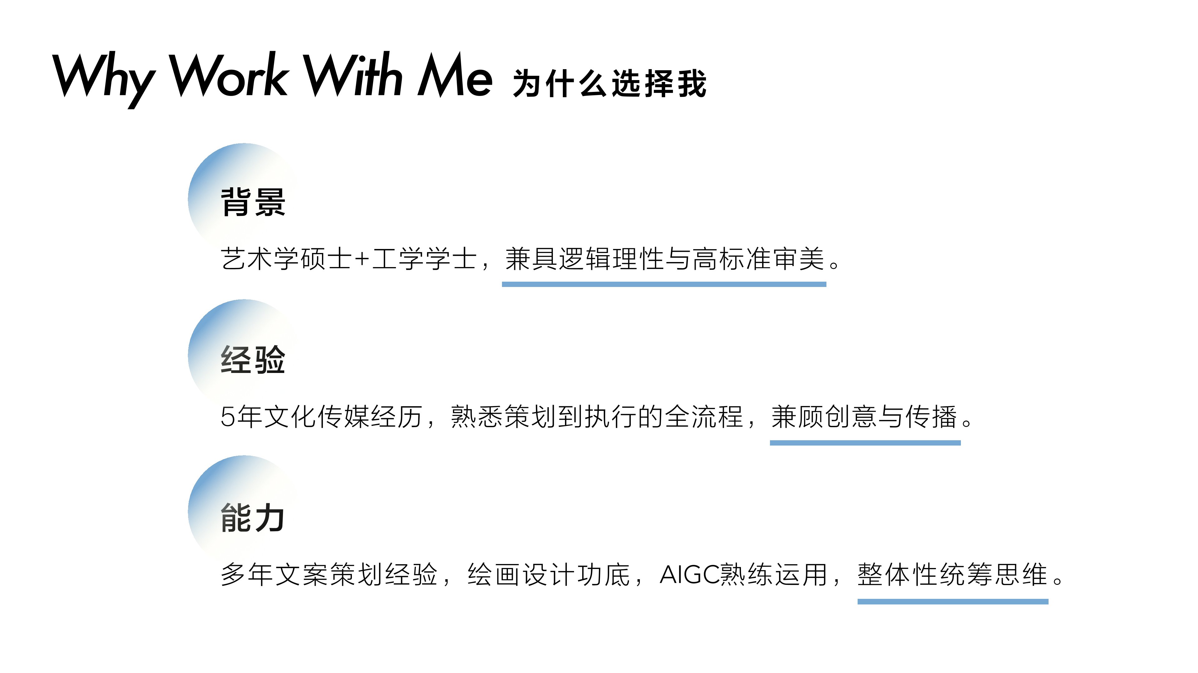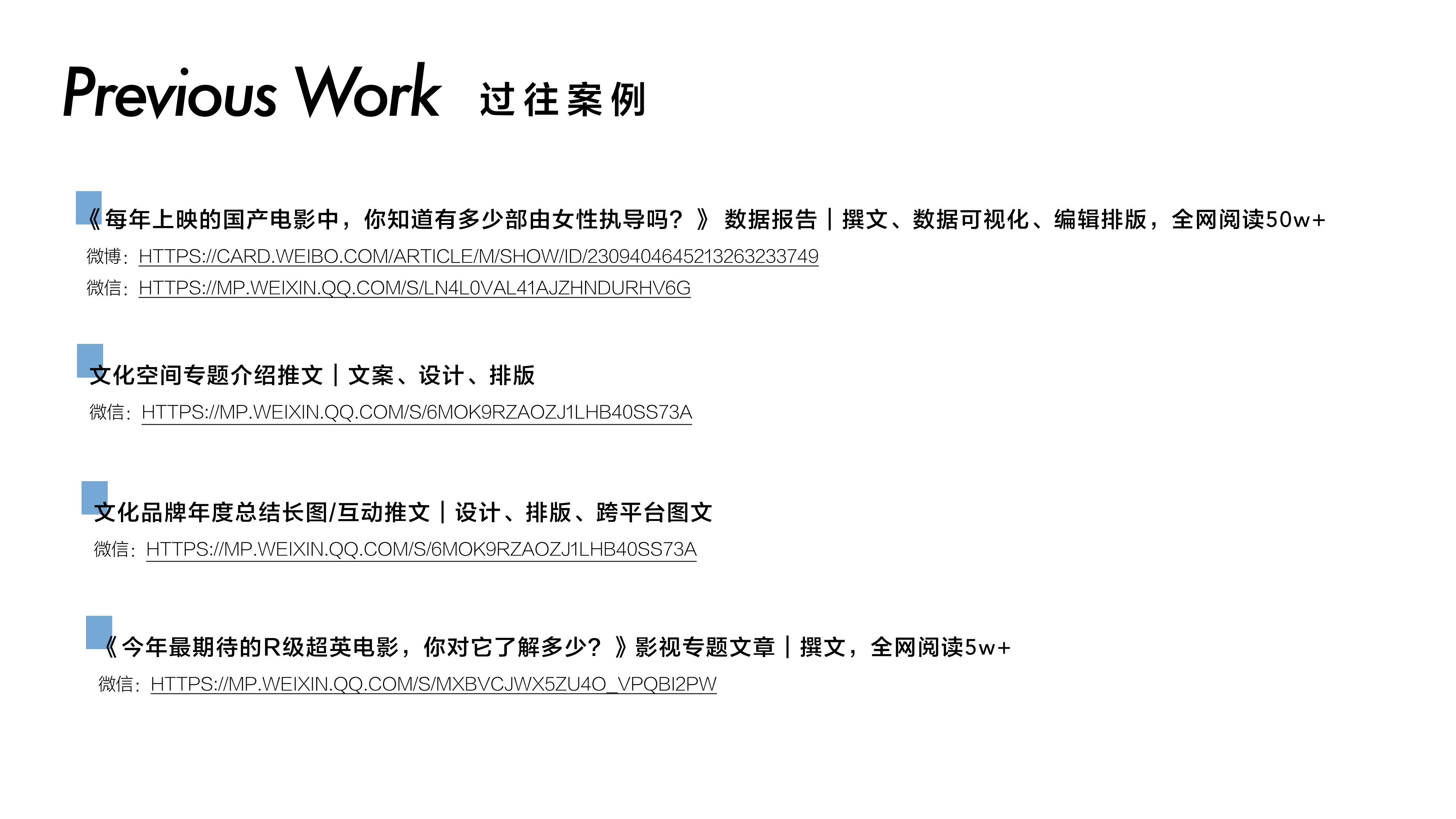 2、5年文化传媒行业经验,工作覆盖品牌及内容策划、媒体运营与传播,熟悉从策划到执行的全流程,兼顾创意与传播。