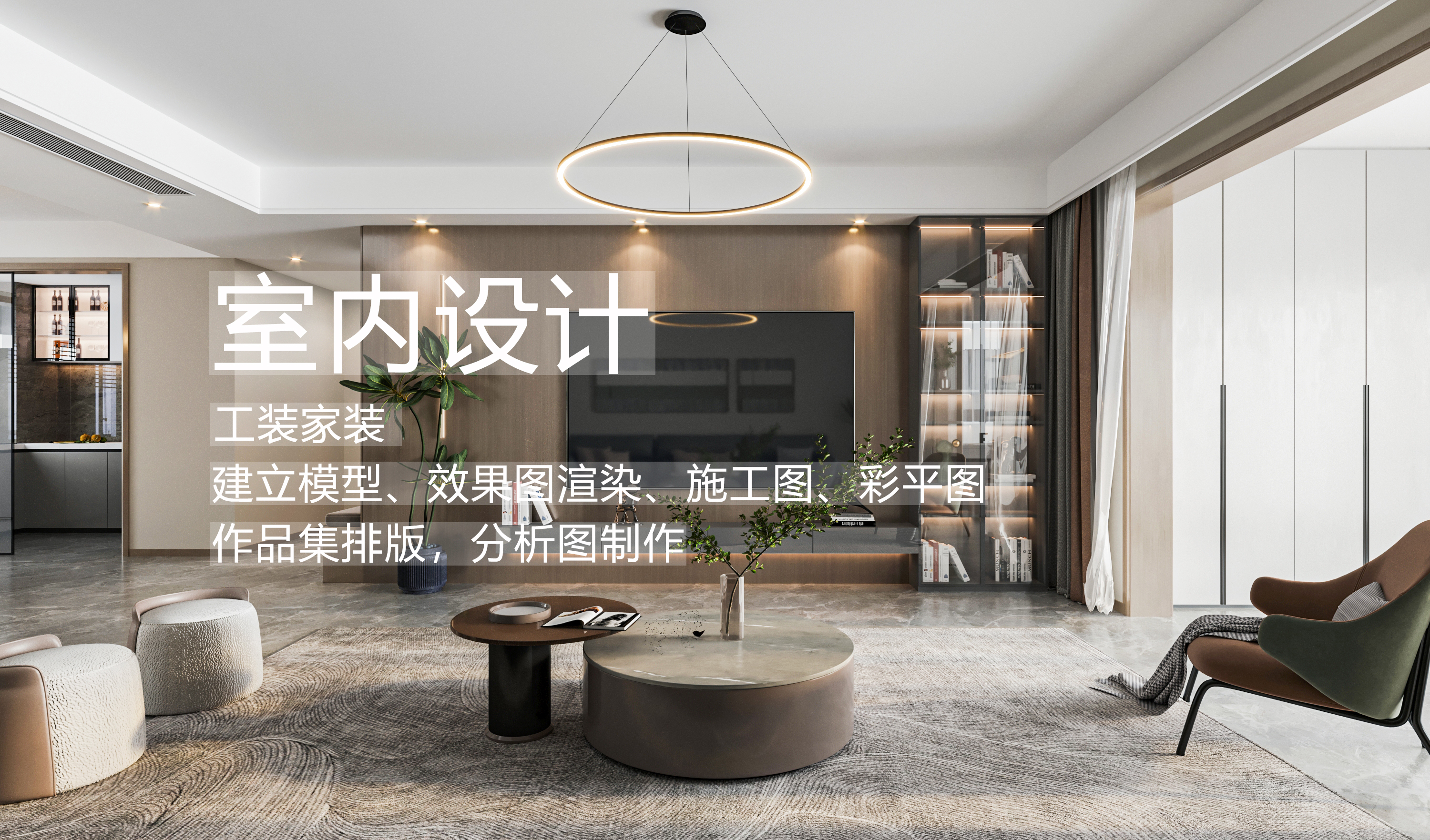 我可以做室内设计整体模型,效果图,整体12张施工图,彩平图,作品集排版,分析图制作