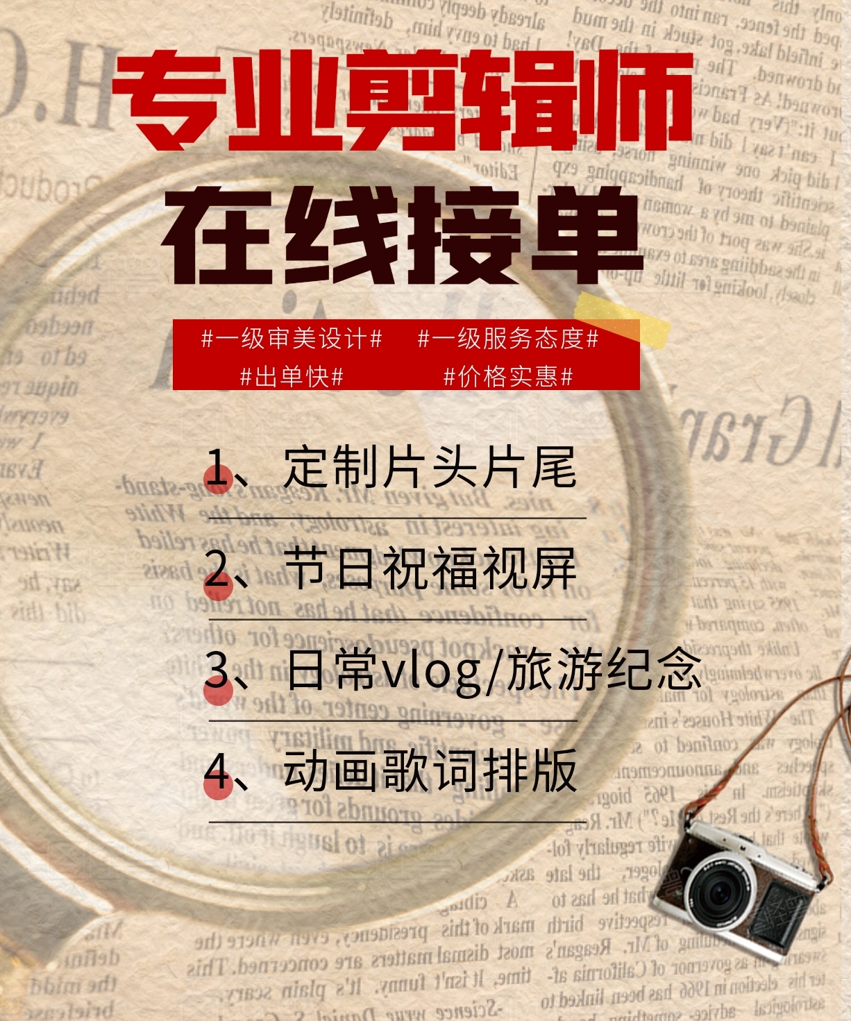 各版本包含的工作: 1、短视频剪辑 2.婚礼视频剪辑 3.商业片剪辑...